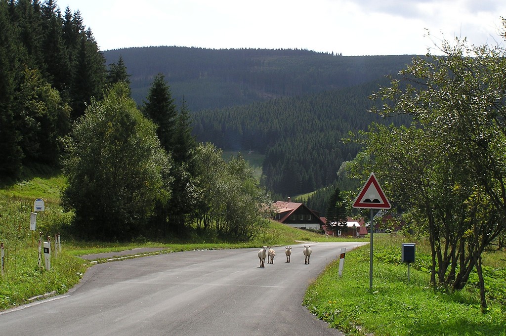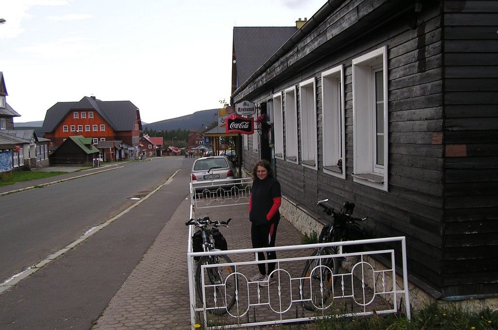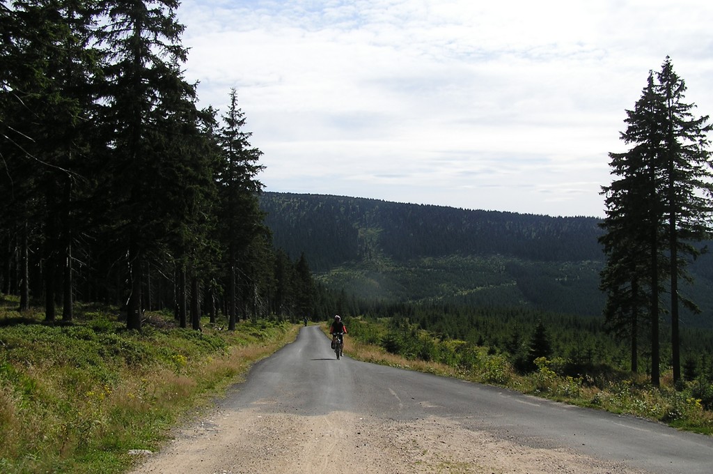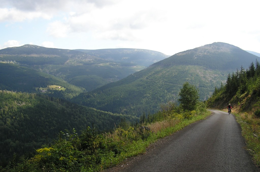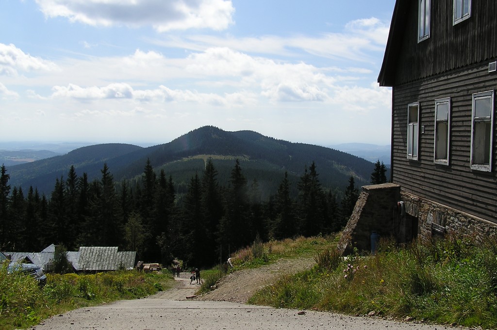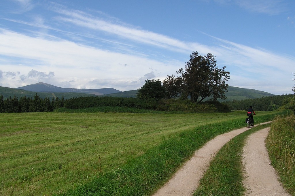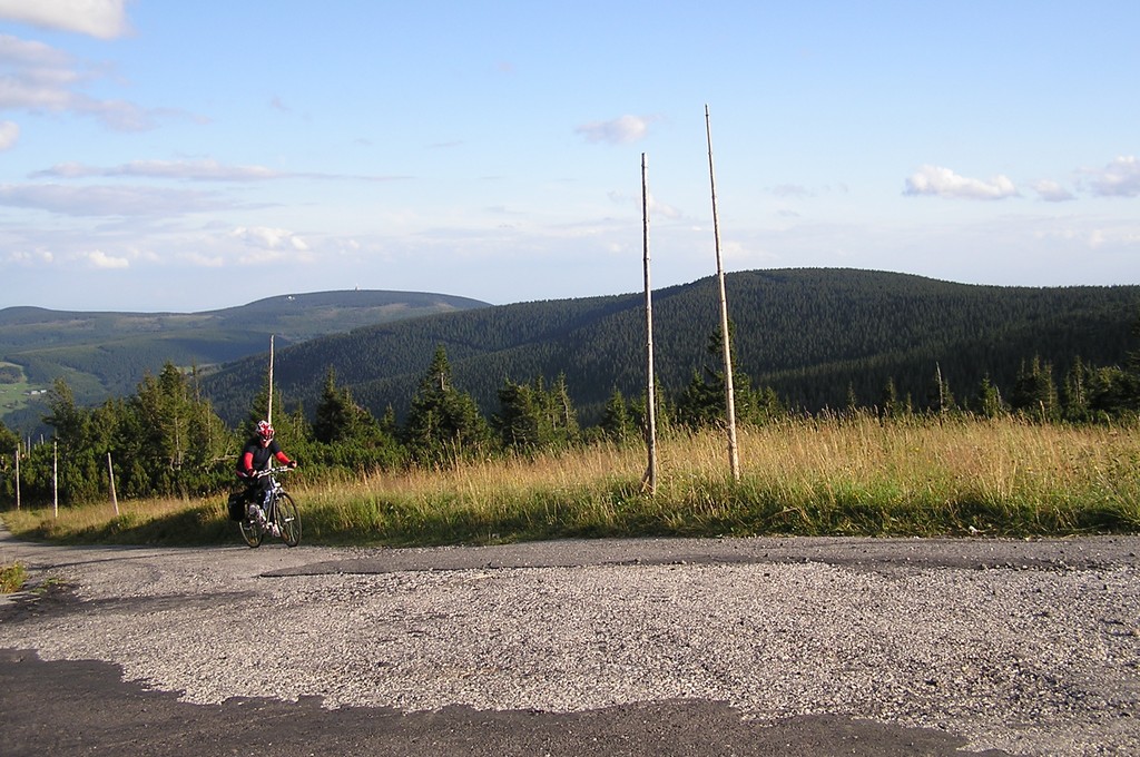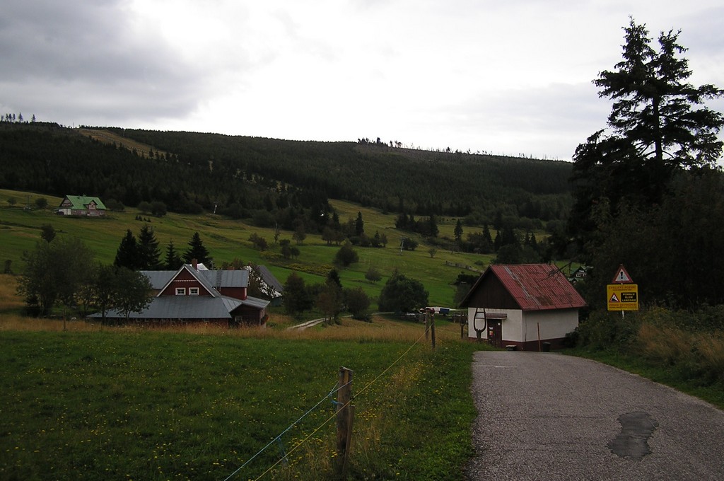 Ráno jsme zatli zuby a věrni „těm vašim pravidlům“ jsme se nenechali zlákat cyklostezkou přímo do Žacléře, ale poslušně jsme se vrátili do Bernatic a jeli přes Královec. Silnice sice inzerovány jako hlavní ale v sobotu dopoledne veskrze prázdné. Počasí stále nic moc, ale neprší. Žacléř jsme poctivě objeli přes místní část Bobr, na moc pěkném náměstí jsme doplnili zásoby vrcholových prémií a vyrazili přes Žacléřský hrad na Bílý kříž. Cesta stále ostřeji stoupala, povrch stále méně vyhovující, ale dá se to vyjet. Po lučních cestách jsme pokračovali směrem na Rýchorský kříž, ale ještě před ním jsme uhnuli vpravo po neznačené cestě směrem na Roh hranic – cesta lesní, po vrstevnici, vcelku sjízdná. Odtud pokračujeme po cyklostezce dolů do Horních Albeřic, kochajíce se výhledy na Sněžku. Dále Lysečinská bouda, Dolní Malá Úpa, Rennerovy a Pomezní boudy. Nebezpečné stoupání (jak pravila i značka) kolem Rennerovek nás dorazilo, takže oběd na Pomezkách přišel vhod, byť jsme ho zapíjeli Krakonošem.