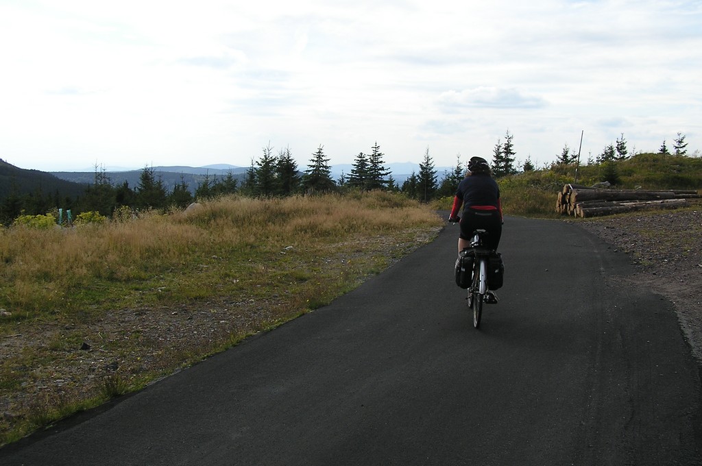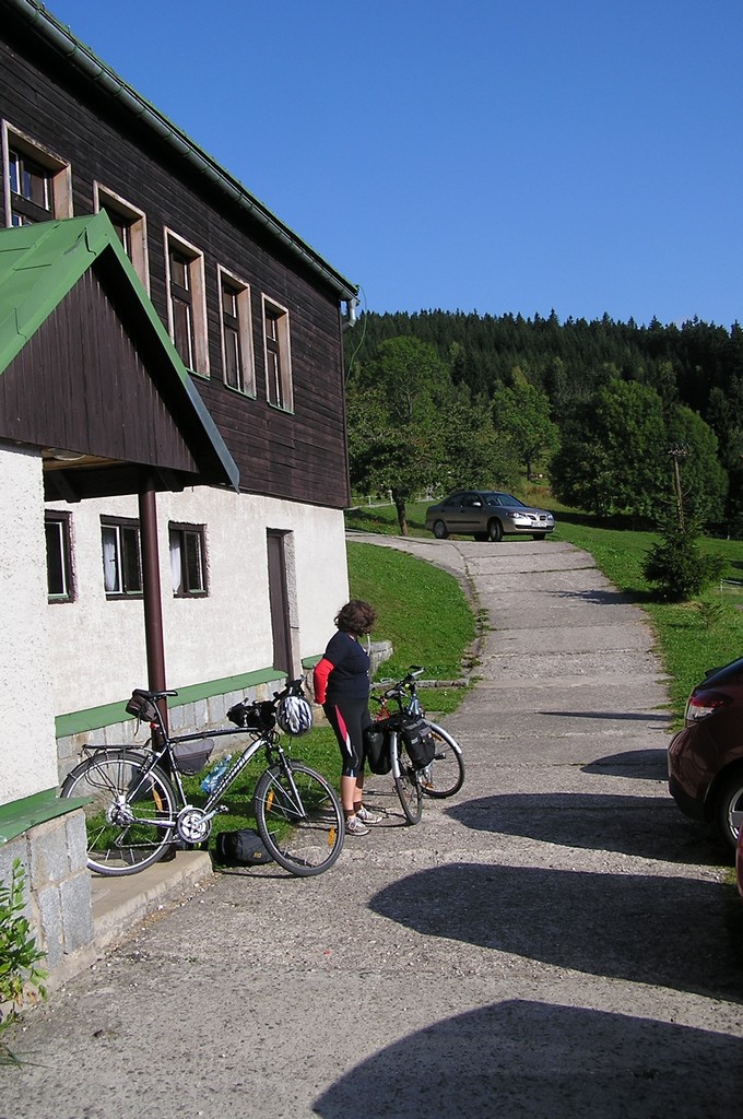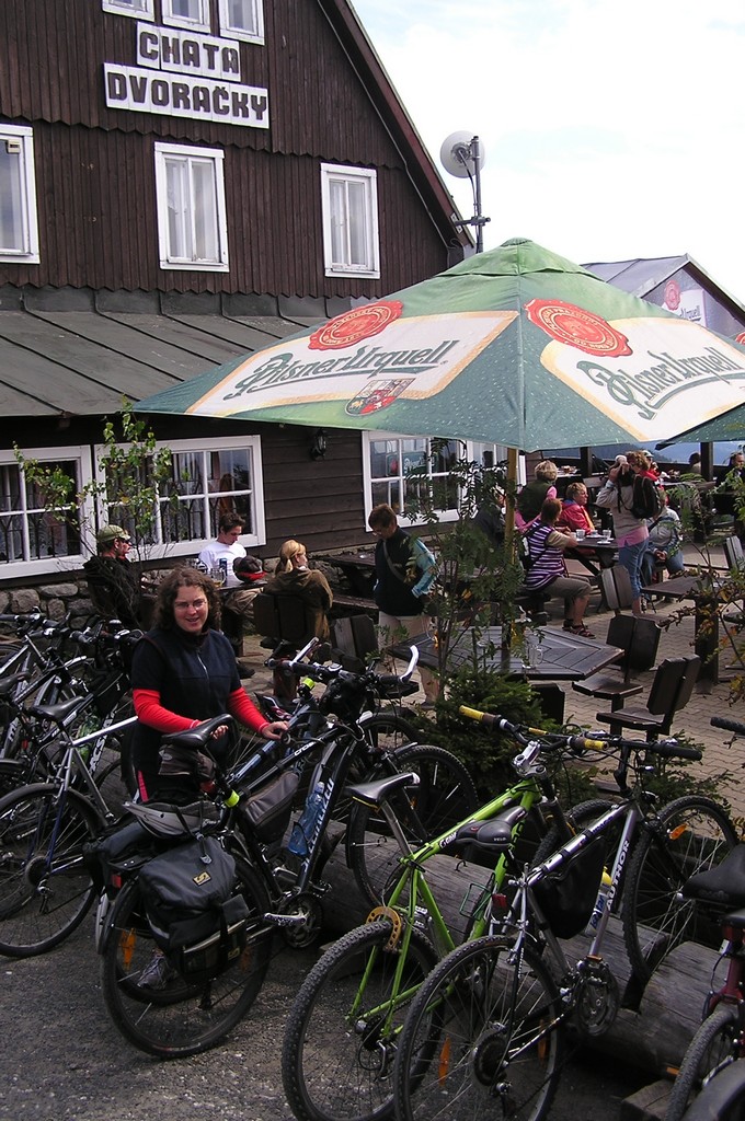 Ráno jsme celí čerství vyrazili známou cestou přes Struhadla na Krásnou pláň (Schönlan), kde jsme uhnuli doleva po cyklo a žluté a přes Hromovku jsme dojeli do Svatého Petra a Špindlu. Tady jsme se chvíli motali a prověřili několik slepých uliček v labyrintu ozdravoven a hotelů, až jsme trefili ten správný táhlý kopec na Medvědín. Stoupání ale snesitelné s úžasnými výhledy, byli jsme ještě čerství, takže jsme v pohodě dorazili na Horní Mísečky. Odtud jsme po silnici pokračovali na Dolní Mísečky a před autobusovou zastávkou jsme uhnuli vpravo na tzv. Vídeňskou cestu (třeba minout závoru) – nezpevněná, ale celkem sjízdná cesta, která ušetří cenné výškové metry. Po cca 2 km narazíte na rozcestí – zvolte Pašeráckou cestu vpravo do kopce (stále nezpevněná, ale sjízdná), která vás bez dalšího zbytečného klesání vyvede přímo na Rozcestí pod Dvoračkami. No, a tady už není co řešit: zakloňte hlavu a až vás začne bolet za krkem, uvidíte Dvoračky a Štumpovku. Je to asi 0,5 km, ale jsem zvědavá, kdo z vás to vyjede. :) Na Štumpovce jsme si dali oběd (osvědčená restaurace, nesčetněkrát prověřeno) a borůvkový koláč a vyrazili jsme na další důvěrně známou trasu dolů na Ručičky (za Dvoračkami po zelené a cyklo vpravo do lesa). Na Ručičkách jsme uhnuli vpravo dolů směrem na Harrachov, ale na dalším rozcestí jsme hrdě minuli cestu na Rýžoviště a do Harrachova a pokračovali na Krakonošovu snídani. Tady jsme opět minuli cestu do Harrachova přes Mumlavský vodopád a vydali se směrem na Voseckou; na rozcestí Pod Voseckou se dáváme samozřejmě vlevo a čeká nás několik dlouhých kilometrů do Harrachova, které sice převážně klesají, ale to zdaleka neznamená, že bychom už ani nešlápli. Cedule s odbočkami na Harrachov už ani nepočítáme a sveřepě se držíme naší cyklo, která nás nakonec dohoupe až na hlavní silnici od polských Jakušic. Vlevo z kopce a konečně Harrachov. Čas nás trochu tlačí, takže neleníme a pokračujeme přes centrum, kde uhýbáme na cyklo a po silničce se šplháme k harrachovskému nádraží. To samozřejmě mineme a pokračujeme do Kořenova, kde jsme se naštěstí ve změti názvů celkem zorientovali a šťastně trefili Kořenov žst. (která je ve skutečnosti v Polubném). Závěrečná fotka, lahváče do vlaku a za 10 min. už nám to jelo… To už se vás ale netýká, protože vy ještě před Kořenovem uhnete a podél Jizery se vydáte na Jizerku.