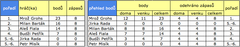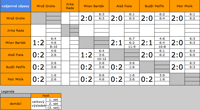 Mrož ztratil při své cestě za tím, aby si mohl doma ponechat putovní pohár, pouhý jeden set. Na druhém a třetím místě to bylo těsnější. Svou účast v lize musel bohužel vzdát kvůli zraněnému kolenu Jirka Rada. Jeho dva odehrané zápasy byly anulovány a jeho odstoupení výrazení usnadnilo Milanovi cestu ke 2. místu a Alešovi ke 3. Přejme Jirkovi, aby se dal do příštího ročníku dohromady a vrátil se na přední příčky.