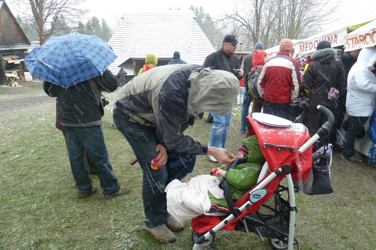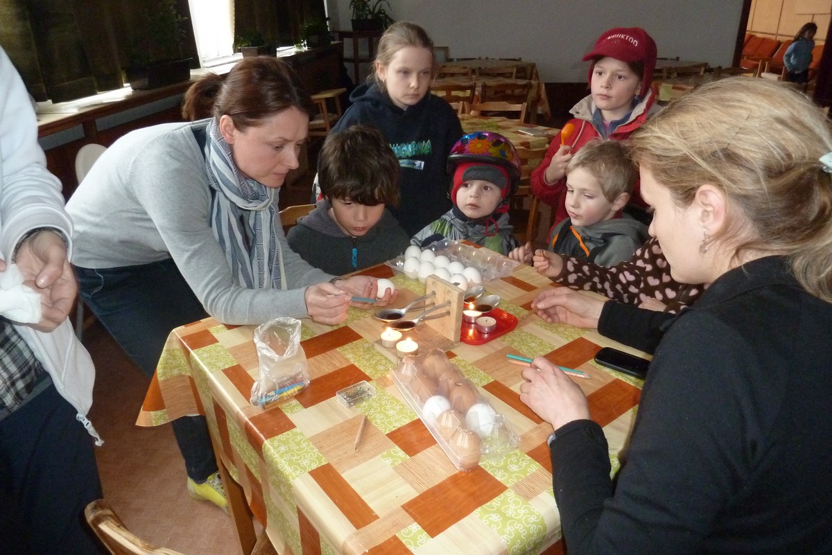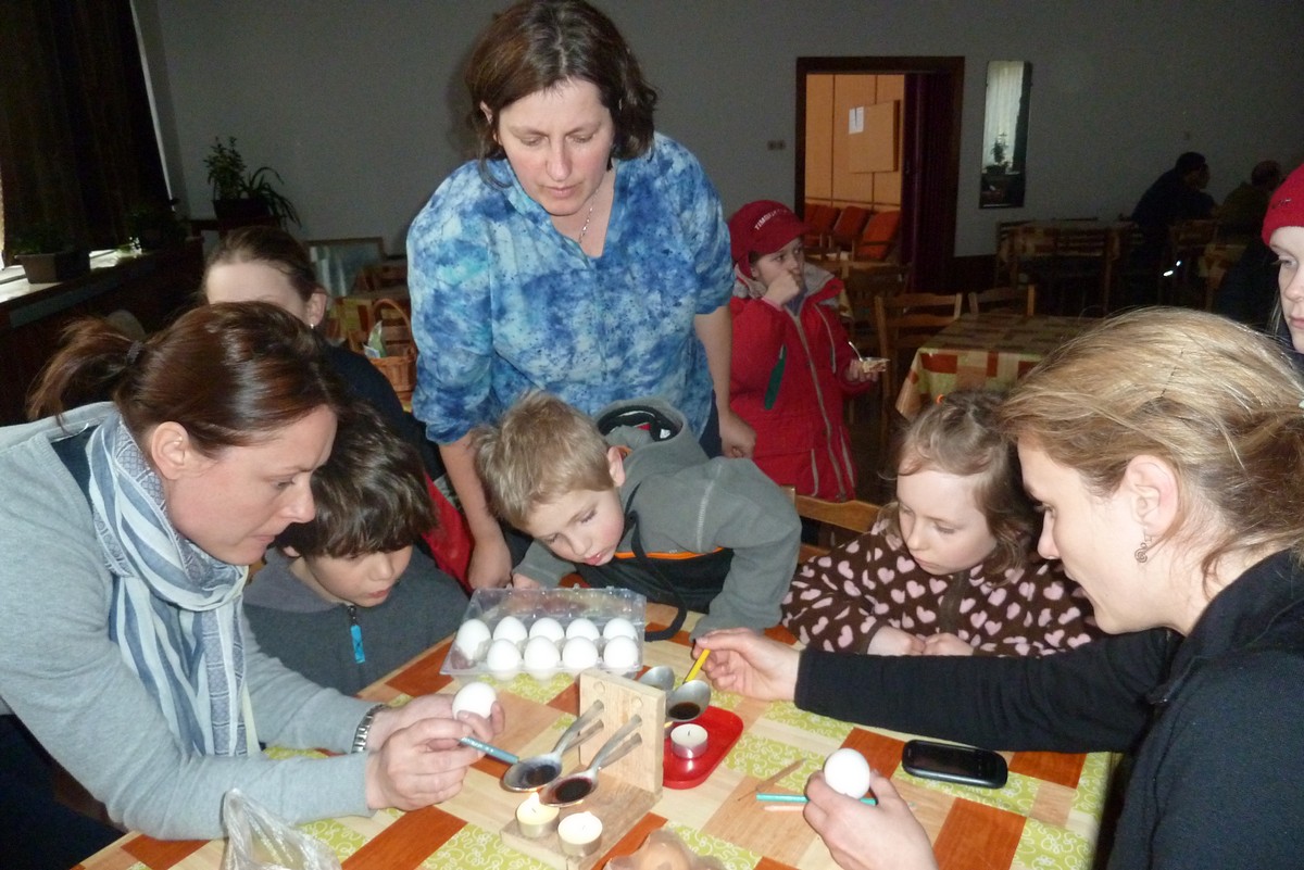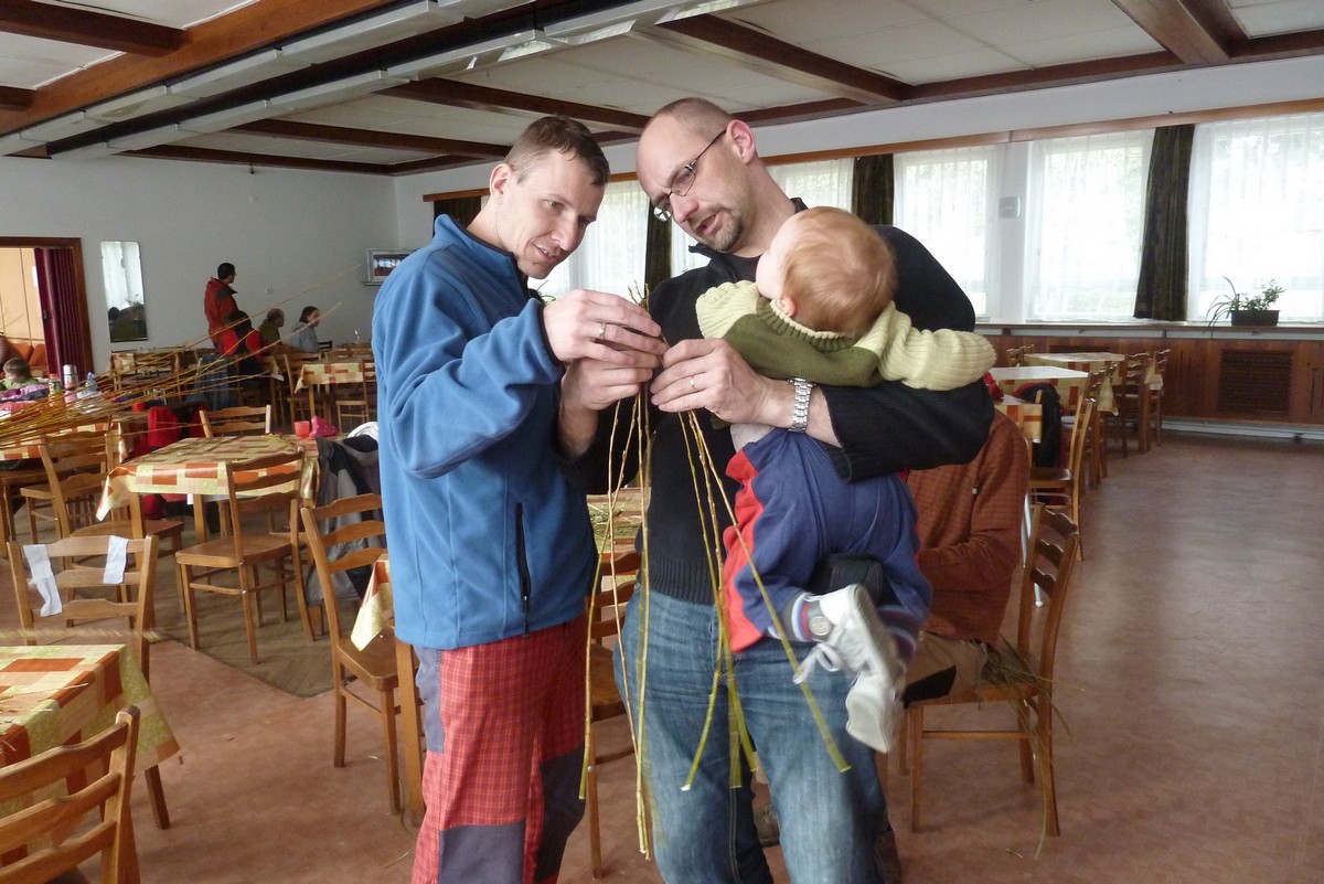 Neděle měla být dle předpovědi lepším dnem celého víkendu a tak padla volba na výlet do nedalekého skanzenu na Veselém kopci. Navíc, kdo by odolal lákadlu velikonočních trhů. Cesta byla v pořádku, dokonce jsme hezky a organizovaně zaparkovali a již méně organizovaně zvládli zakoupit vstupenky, a když jsme si začínali užívat velikonoční atmosféry, počasí se rozhodlo, že nám to vysvětlí a to velice jasně a názorně. Drobné poletující vločky postupně přešly v husté mega sněžení, přes které bylo vidět sotva k následujícímu stavení. Prohlídku jsme všichni statečně dokončili a zvolili ústup přes hotel restaurant v Nasavrkách, kde jsme se dobře napapali a s plnými bříšky sledovali za okny pravé aprílové počasí. Po návratu vypukly pravé velikonoční orgie. Děti včetně Vítka, Mrože a Míši vyrazily pod vedením Romana na proutky, osamělé matky si tudíž stihly dát kávičku a pak hurá do jídelny a pletly se pomlázky, barvila vajíčka a vůbec se radostně oddávalo přípravám na nadcházející den.
