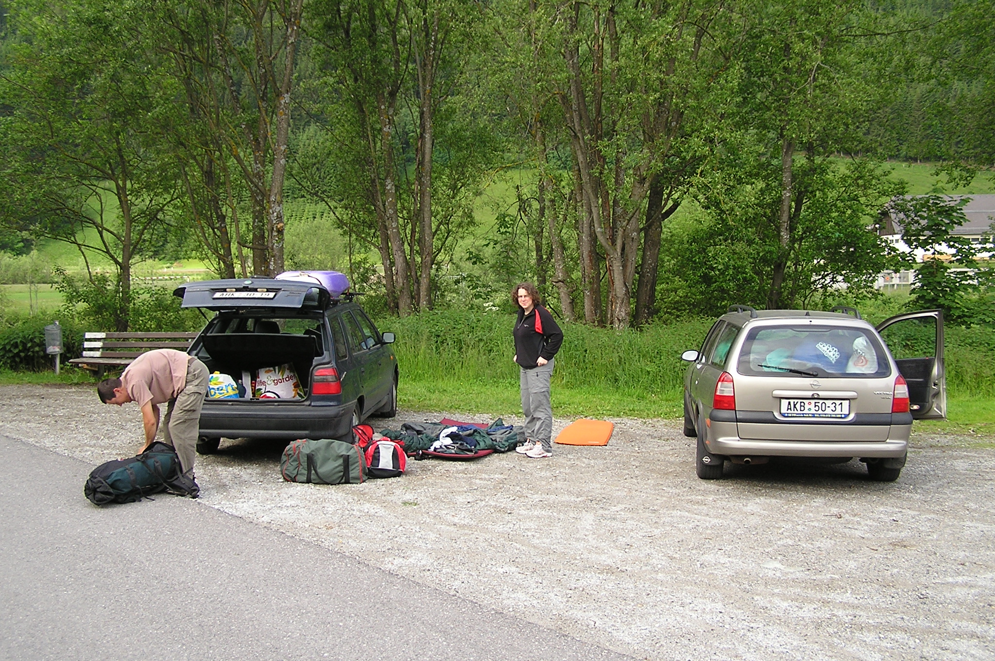 Sraz k odjezdu byl ve Strašnicích u Vokáčů, kde jsme se naložili do dvou aut a vyrazili na jih. Cestou jsme ještě na jižním městě nabrali Markétu a přes Dvořiště pokračovali na Salzburg a St. Michael. Do cílového městečka Tamsweg jsme dorazili tradičně kolem jedné hodiny ranní. Když jsme ve dvě ani po několikerém průjezdu městem ani po komunikaci s domorodci nenašli žádný ze značených kempů, ustlali jsme si na parkovišti u řeky. Ráno v šest nás vzbudily zvony, potom dechovka a kolem osmé už nám bylo blbé spát u frekventované cyklostezky – byl totiž svátek.