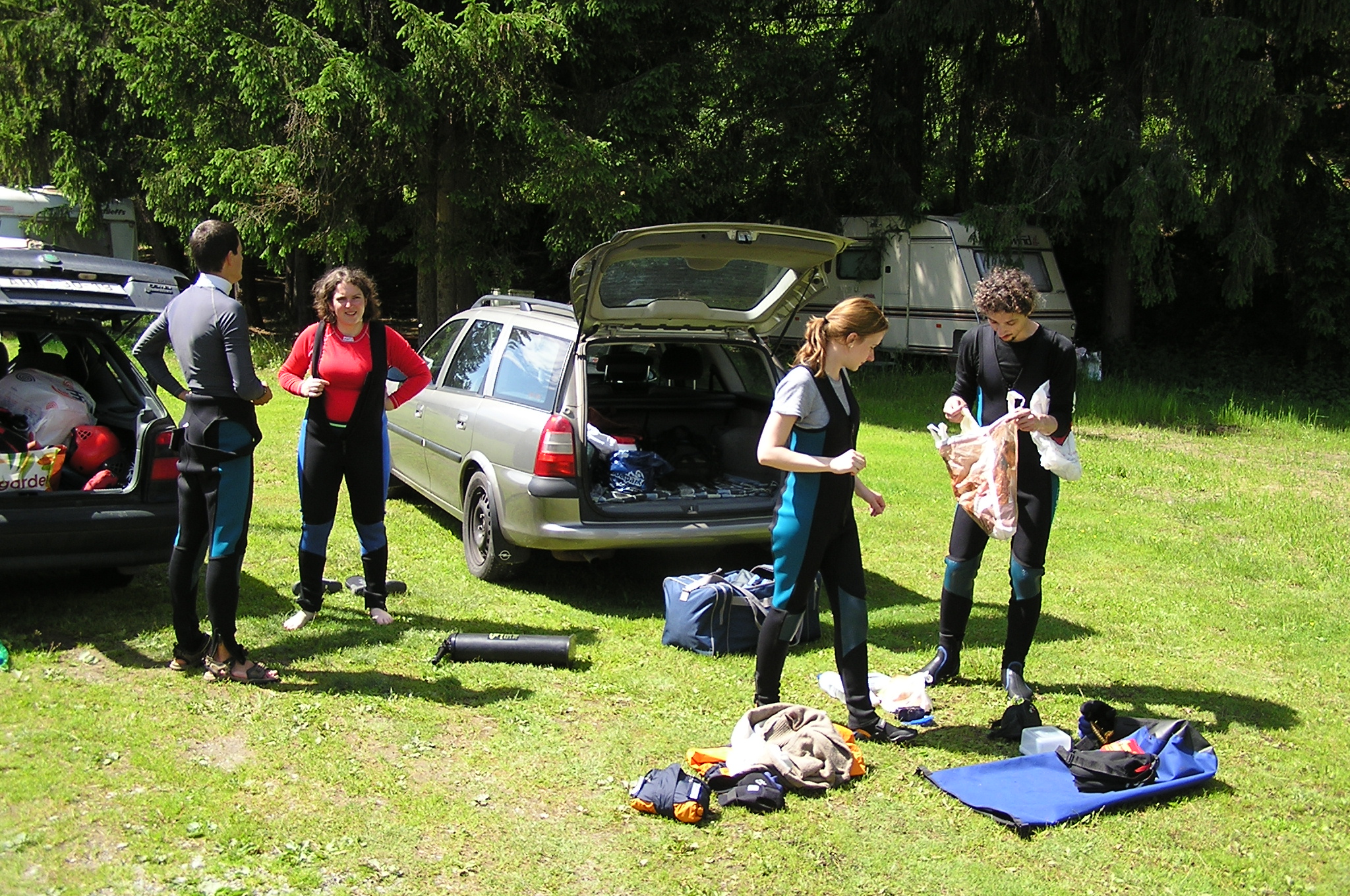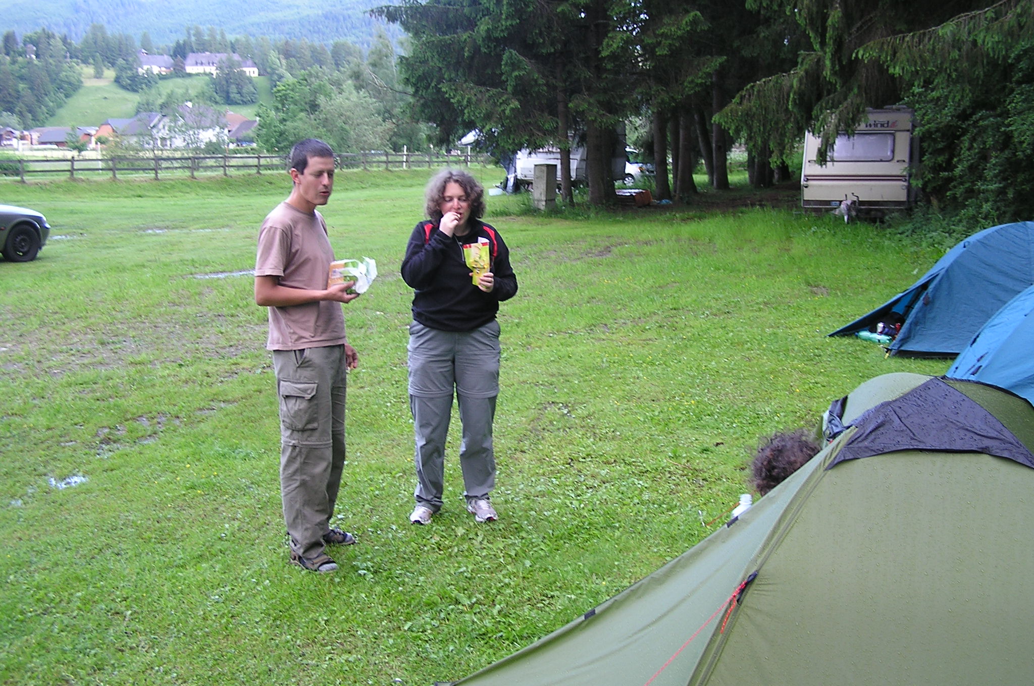 Naložili jsme se do aut a po neúspěšném pokusu sehnat informace jsme se vydali do vedlejší vesnice, kde byl v mapě také značený kemp. Nakonec jsme našli ten v Tamswegu a zjistili, že včera v noci jsme projížděli cca 100 m od kýžené odbočky… (až tam pojedete – nezajíždějte do města, odbočka je hned na kraji města.) V tichém a poloprázdném „Waldcampu Tamsweg“ jsme si mezi karavany postavili své tři stany a vyrazili na vodu – Taurach na rozpádlování. Ve vesnici Mautendorf jsme zaparkovali auto u sportovního letiště a vydali se dolů po proudu úzkým korytem a mračny much. Příjemná nenáročná voda do WW2, místy stupně. Po asi hodině nás zastihla bouřka, kroupy a cca 7 m vysoký jez. Ten jsme po konzultaci s kilometráží a prohlédnutí sjeli středem – nic tam nebylo, ale tobogán to byl slušný… Kolem třetí odpoledne jsme se vylodili v kempu a vzhledem k velmi hustému dešti jsme se rozhodli pro návštěvu nedalekého bazénu se saunou.