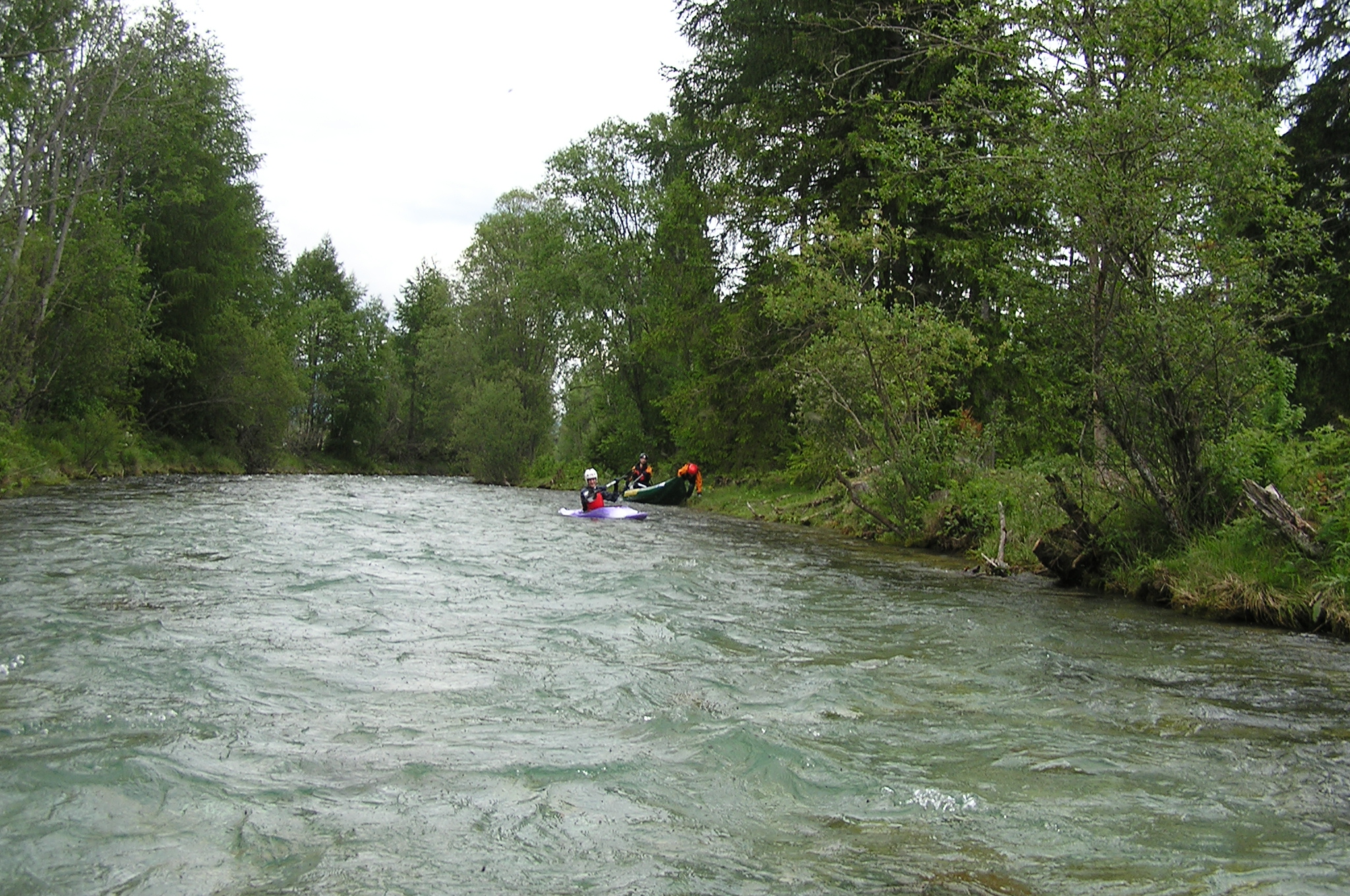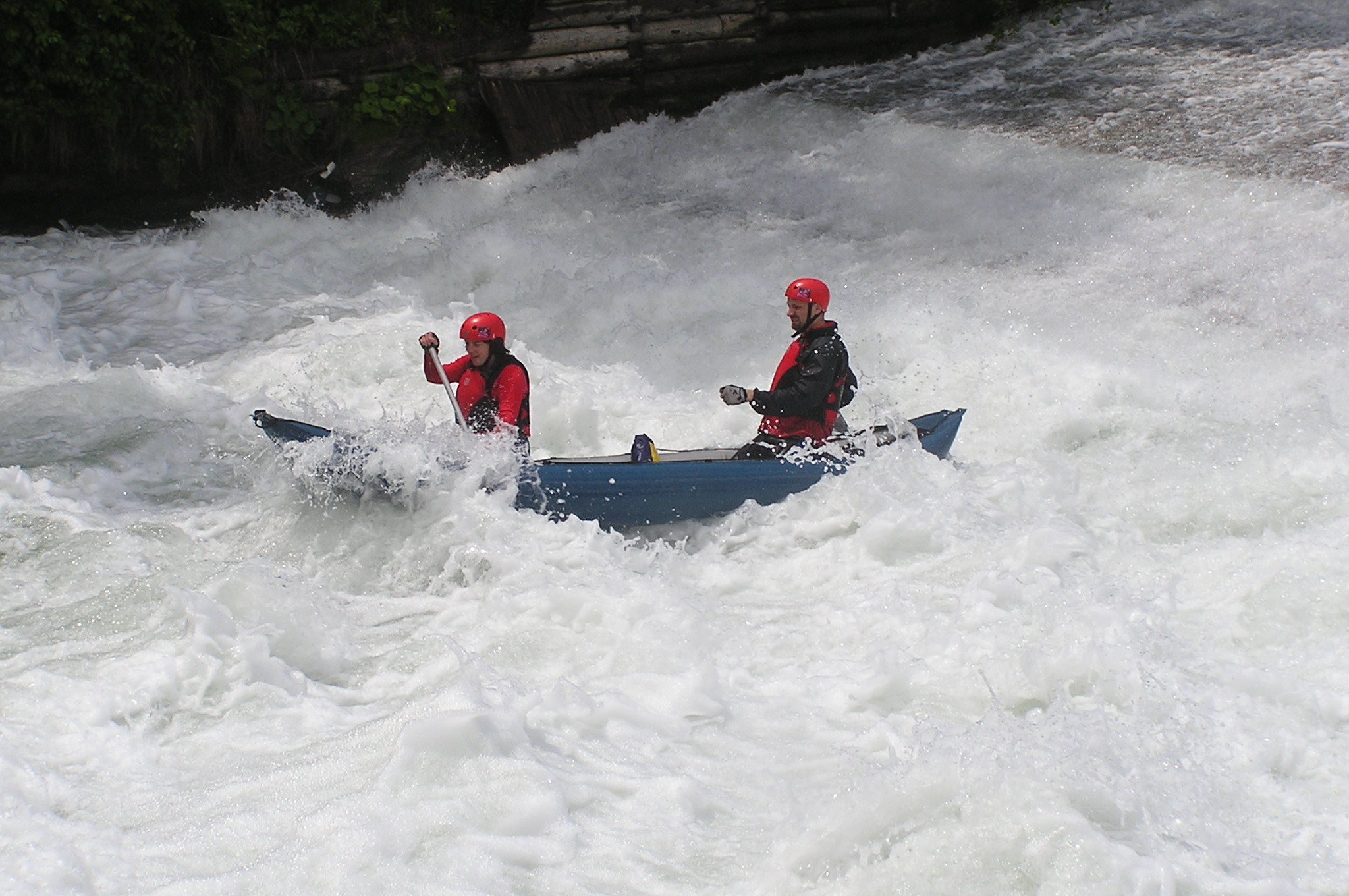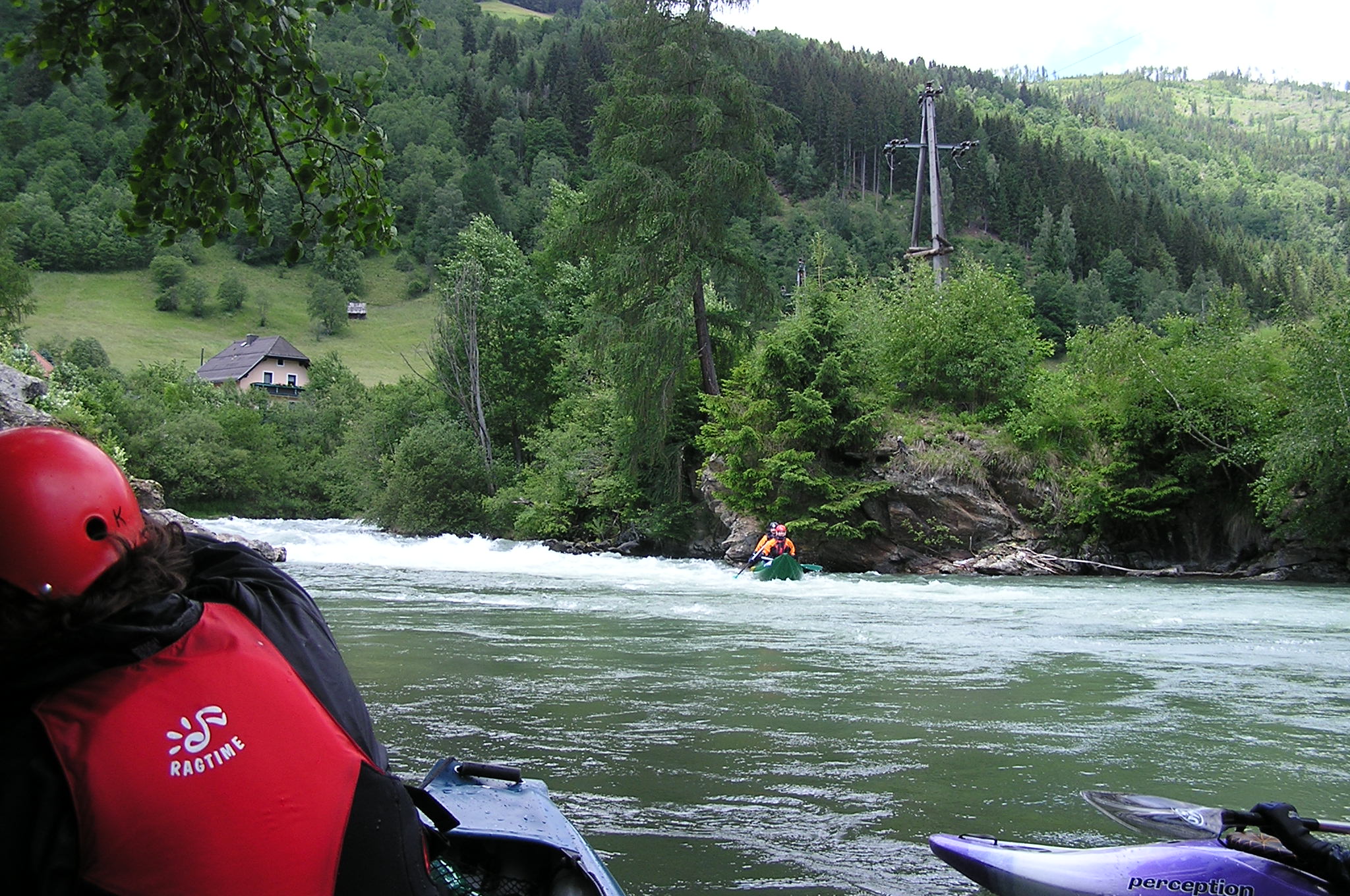 V neděli jsme se rozhodli pro řeku Isel. Ráno jsme se tedy sbalili, v sedle nad obcí Winklern jsme překročili zemskou hranici mezi Korutanami a Tyrolskem a sjeli do povodí Drávy. Projíždíme Lienz, kousek nad ním u silničního mostu necháváme jedno auto a pokračujeme podél řeky nahoru. Nad vesnicí Huben ještě chvilku okouníme na lákavou soutěsku se čtyřkovými peřejemi, nakonec jsme se ale rozhodli ji nejet. A dobře jsme udělali. Kolem poledne nasedáme do lodí na doporučeném místě a zjišťujeme, že ty pěkné peřejky, které jsme viděli z auta, v kombinaci s vysokým stavem vody vytváří poctivou WW III až III+. Ve vlnách často mizím nejen já, ale i Míša na kormidle, mléčně bílá voda řve a my máme co dělat, abychom se s ní vypořádali. Ač jsme několikrát měli na mále, nakonec jsme vše ustáli. Ne tak druhá posádka, která si ve vlnách pěkně zaplavala, Vašek zase předvedl dva ukázkové eskymáky. Než se nám ale podařilo dostihnout ujíždějící převrácenou loď Alana s Markétou, proud ji jako zdechlinu vyhodil břichem vzhůru na kámen uprostřed proudu. Chvíli jsme se pokoušeli k ní dostat, ale proud odvážlivce přivázaného na házečce vždy strhnul. Úspěšné nebyly ani pokusy uvolnit loď házením kamenů. Po asi hodině marných pokusů Vašek pravil, že už ho to nebaví a že jde loď sundat. A jak řekl tak udělal – na druhý pokus se mu podařilo najet k lodi a uvolnit ji.