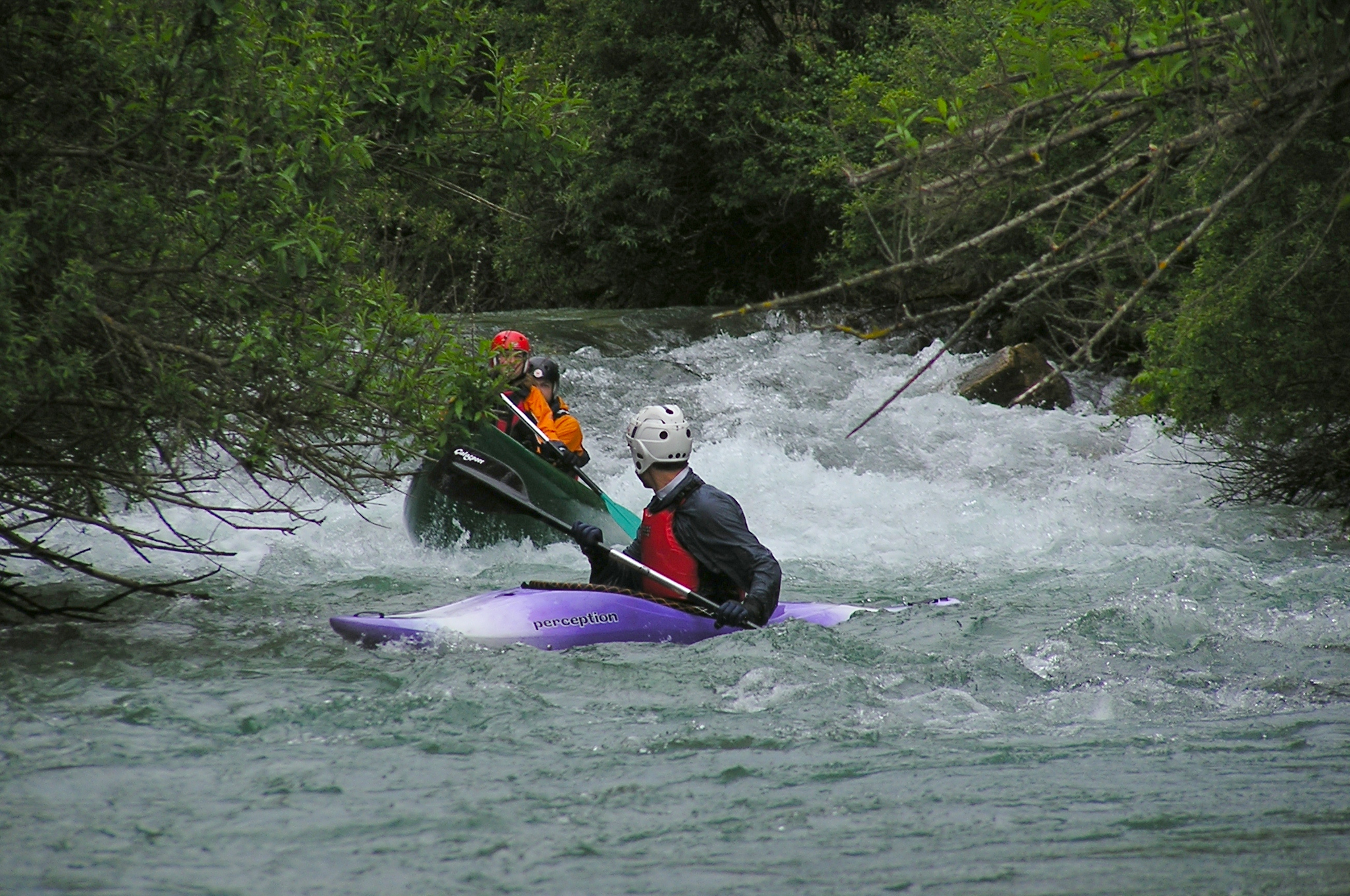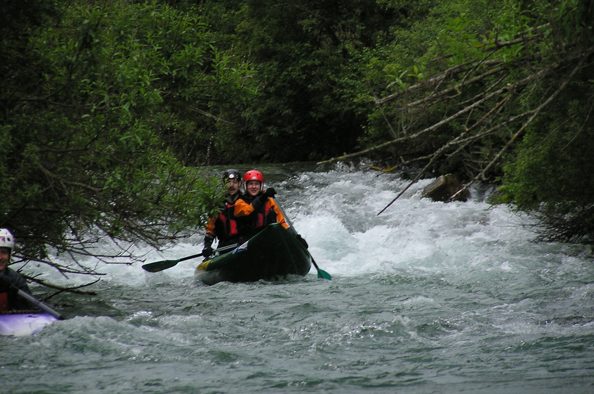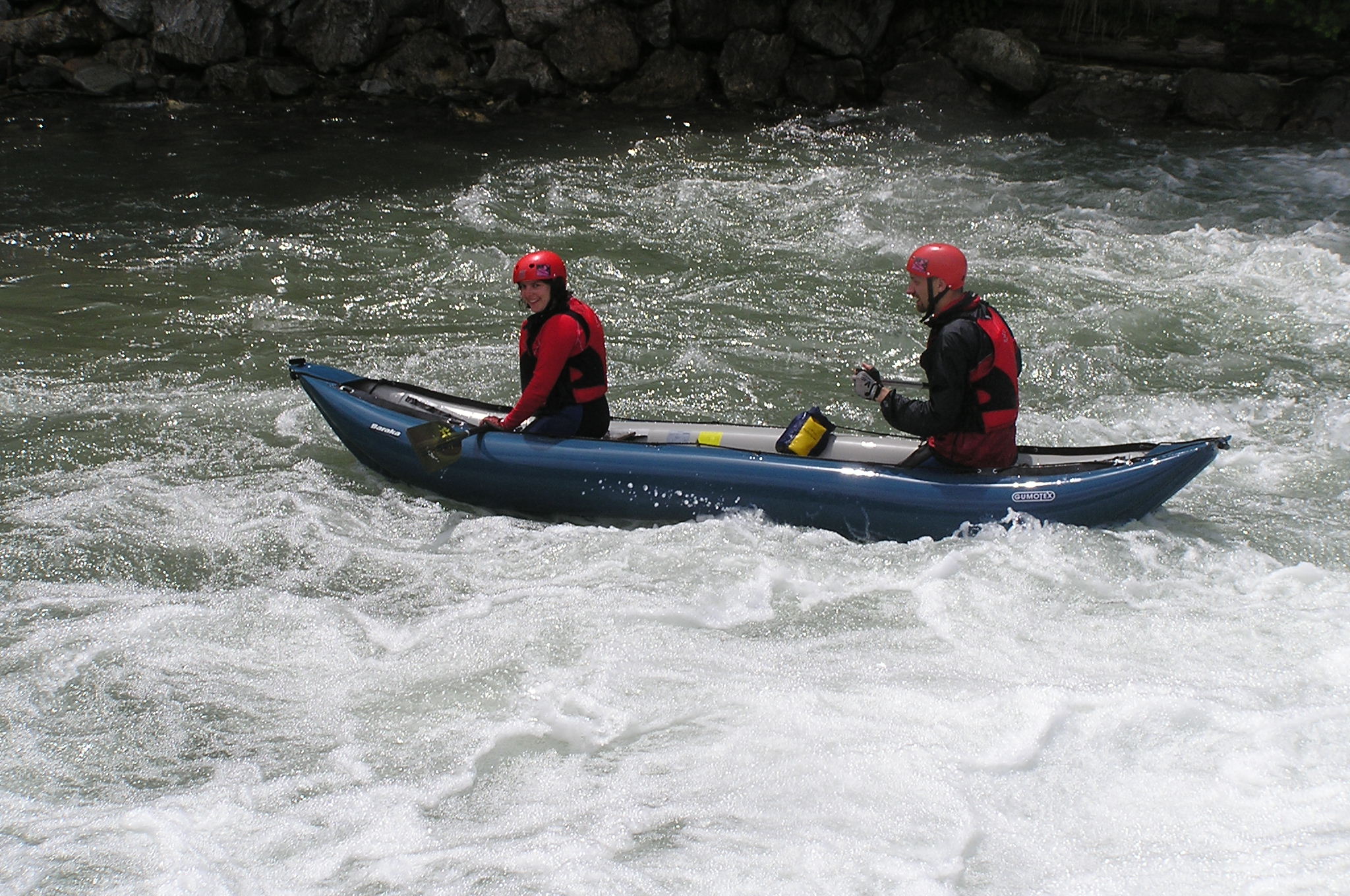 V neděli jsme se rozhodli pro řeku Isel. Ráno jsme se tedy sbalili, v sedle nad obcí Winklern jsme překročili zemskou hranici mezi Korutanami a Tyrolskem a sjeli do povodí Drávy. Projíždíme Lienz, kousek nad ním u silničního mostu necháváme jedno auto a pokračujeme podél řeky nahoru. Nad vesnicí Huben ještě chvilku okouníme na lákavou soutěsku se čtyřkovými peřejemi, nakonec jsme se ale rozhodli ji nejet. A dobře jsme udělali. Kolem poledne nasedáme do lodí na doporučeném místě a zjišťujeme, že ty pěkné peřejky, které jsme viděli z auta, v kombinaci s vysokým stavem vody vytváří poctivou WW III až III+. Ve vlnách často mizím nejen já, ale i Míša na kormidle, mléčně bílá voda řve a my máme co dělat, abychom se s ní vypořádali. Ač jsme několikrát měli na mále, nakonec jsme vše ustáli. Ne tak druhá posádka, která si ve vlnách pěkně zaplavala, Vašek zase předvedl dva ukázkové eskymáky. Než se nám ale podařilo dostihnout ujíždějící převrácenou loď Alana s Markétou, proud ji jako zdechlinu vyhodil břichem vzhůru na kámen uprostřed proudu. Chvíli jsme se pokoušeli k ní dostat, ale proud odvážlivce přivázaného na házečce vždy strhnul. Úspěšné nebyly ani pokusy uvolnit loď házením kamenů. Po asi hodině marných pokusů Vašek pravil, že už ho to nebaví a že jde loď sundat. A jak řekl tak udělal – na druhý pokus se mu podařilo najet k lodi a uvolnit ji.