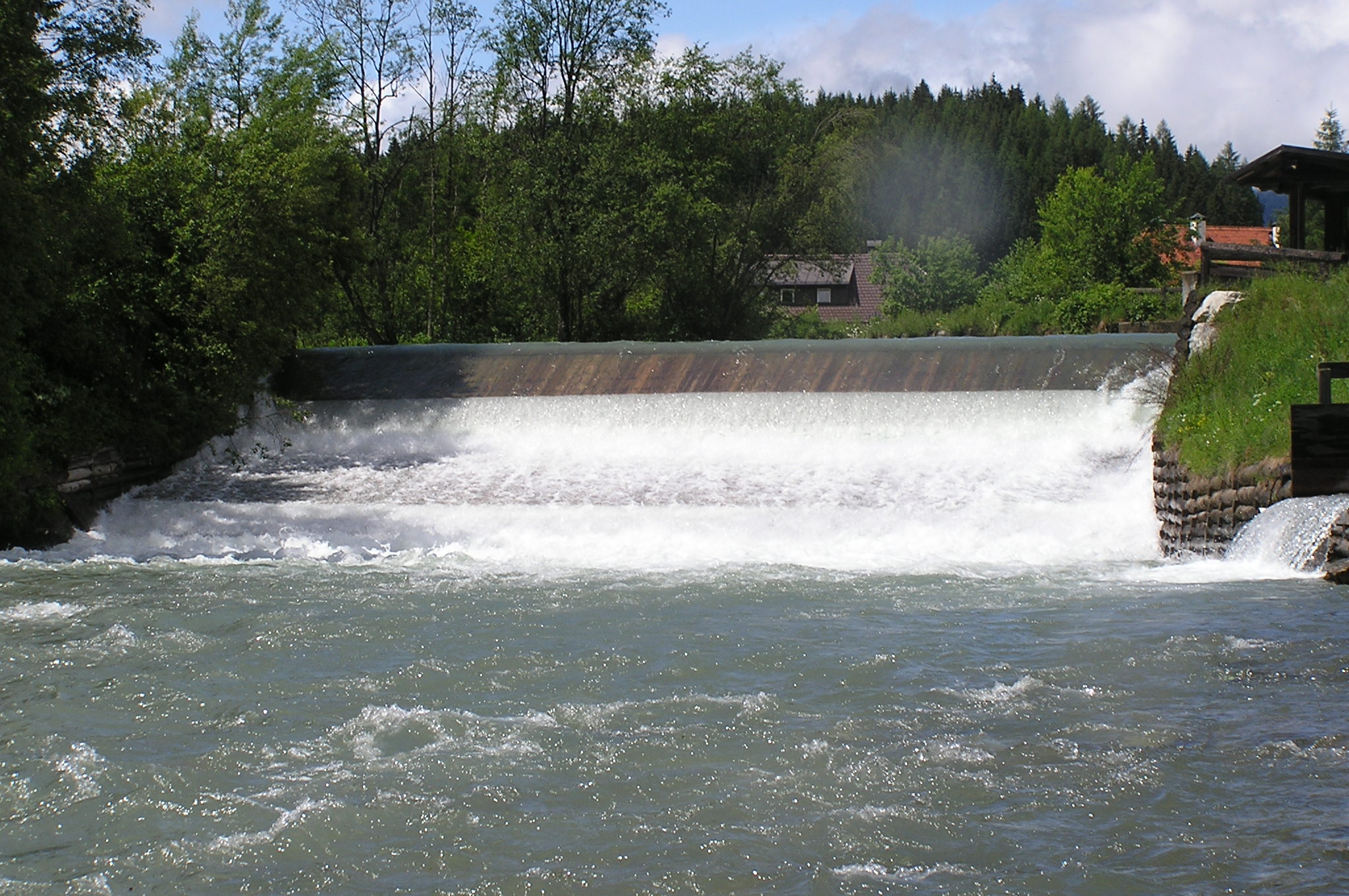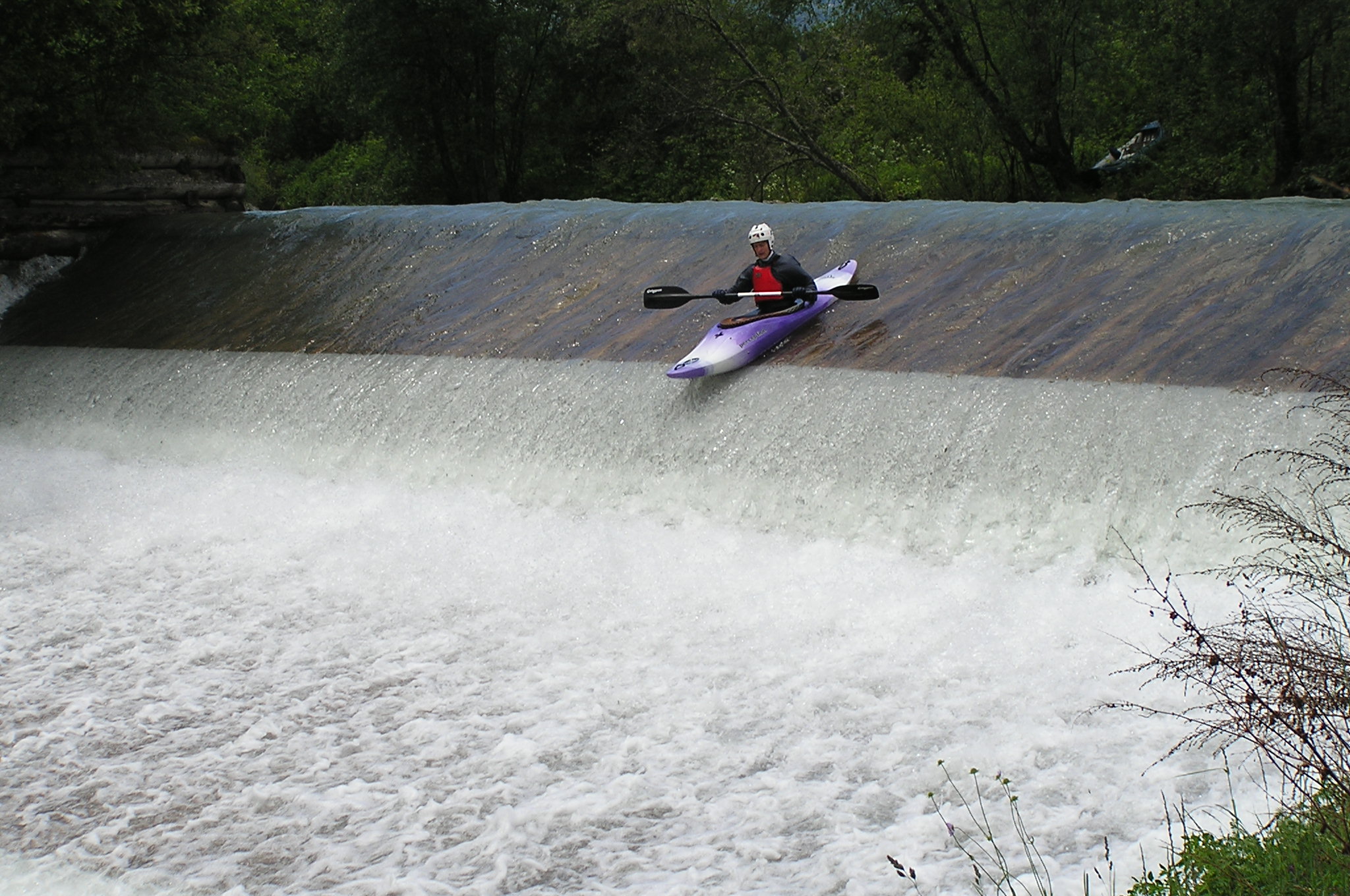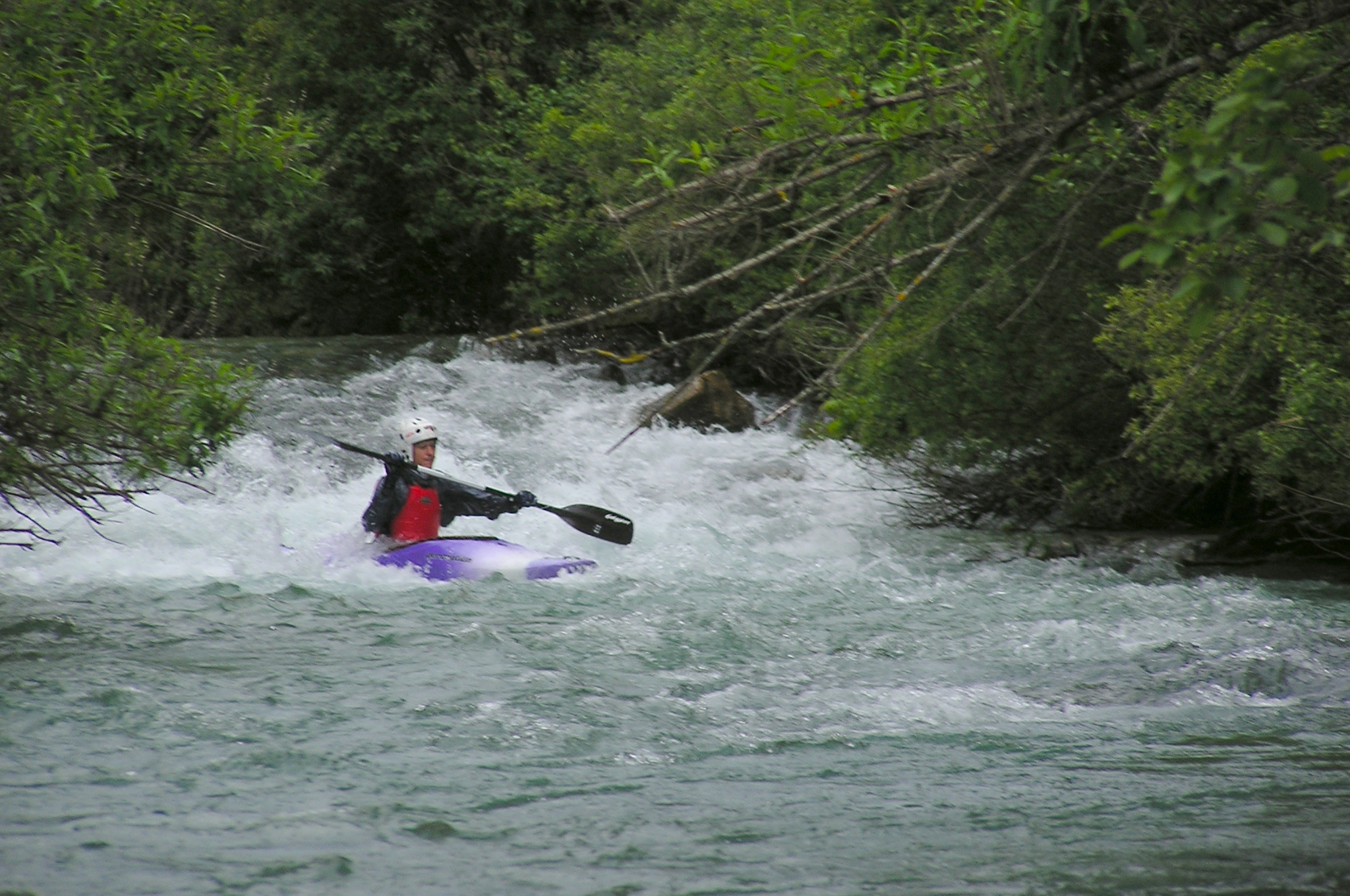 V sobotu ráno jsme se dohodli, že nebudeme komplikovat život sobě ani závodníkům na dolním toku a sjedeme horní úsek Mollu, který je inzerován jako WW II-III. Autem stoupáme údolím podél řeky, a z toho, co vidíme, usuzujeme, že asi půjdeme občas i pěšky – oproti zvednutému Taurachu a Muru to vypadá, že Moll je na suchu. Cestou v městečku Winklern necháváme jedno auto a do lodí nasedáme o několik km výše v obci Putschall pod asi čtyřmetrovým nesjízdným jezem. Při bližším ohledání řeky musíme zkonstatovat, že to přeci jenom půjde: celkem slušné peřeje, zejména nahoře pod elektrárnou nám nedají zahálet, Markétu s Alanem dokonce jedna z nich vysadí na šutr s ne příliš vhodně umístěným kmenem. Nižší vodnatost řeky prověřuje především manévrovací schopnosti posádek. U auta jsme se shodli, že se nám úsek líbil a že si ho dáme ještě jednou. V závěru druhé plavby mi Vašek dopřál životní zážitek: ačkoliv se voda příliš nepodobá kýženému voleji, oblékám se do jeho kajaku. Dostane se mi instrukcí, že mám jet po proudu a pádlovat a že to nic není. No, nevím - kajak se mnou je daleko vratší než kajak s Vaškem a rozhodně se nedá říct, že bych se jenom tak vezla – je to pěkná dřina. Ale kluci mi dělají skvělý doprovod, takže bez úhony a koupání dojedu až k výstupnímu místu, kde mě má eskorta natlačí na mělčinu, aby mě neodnesl proud.