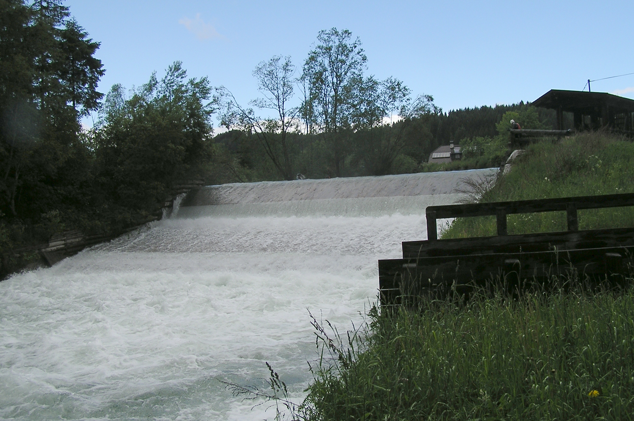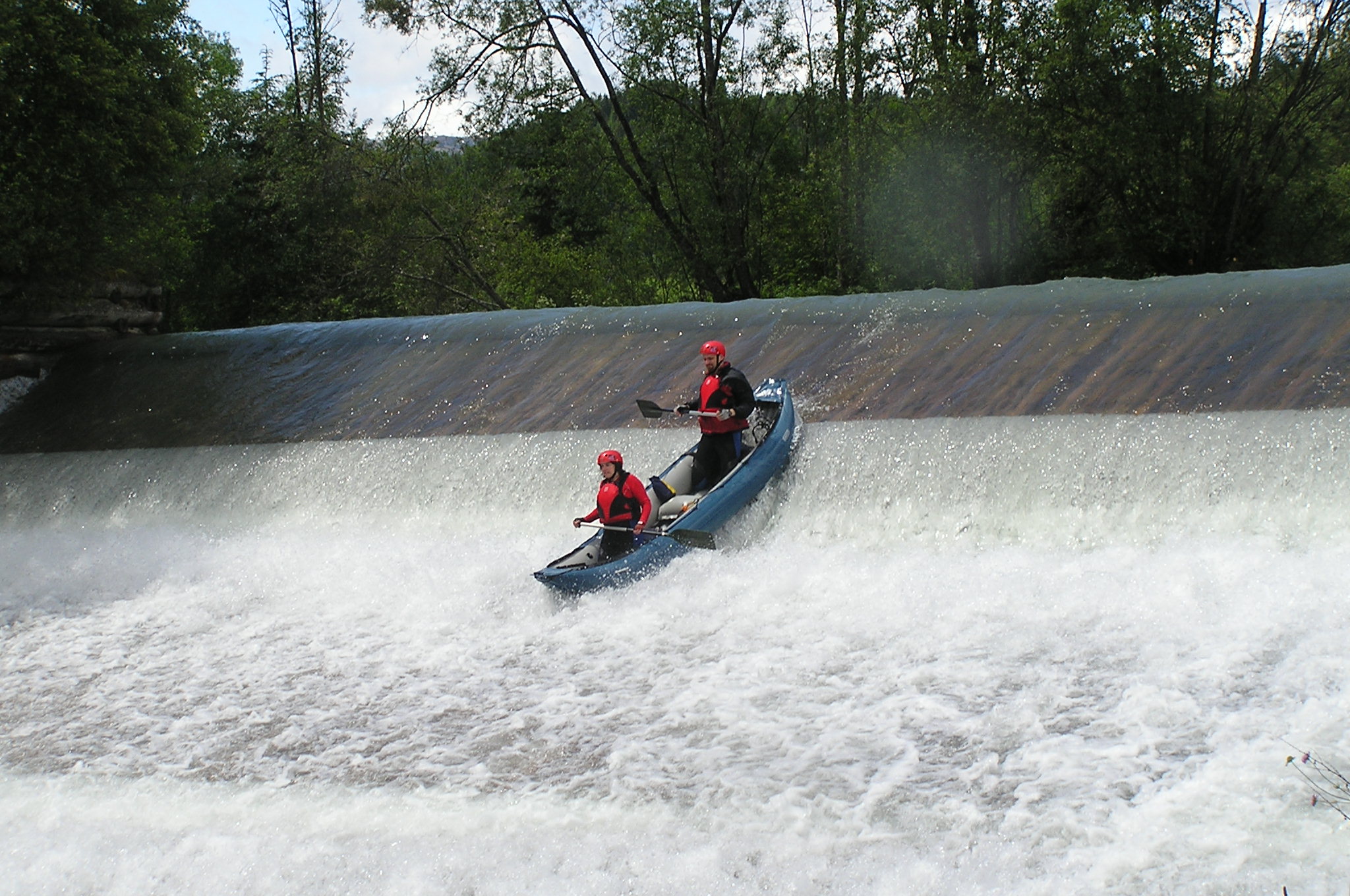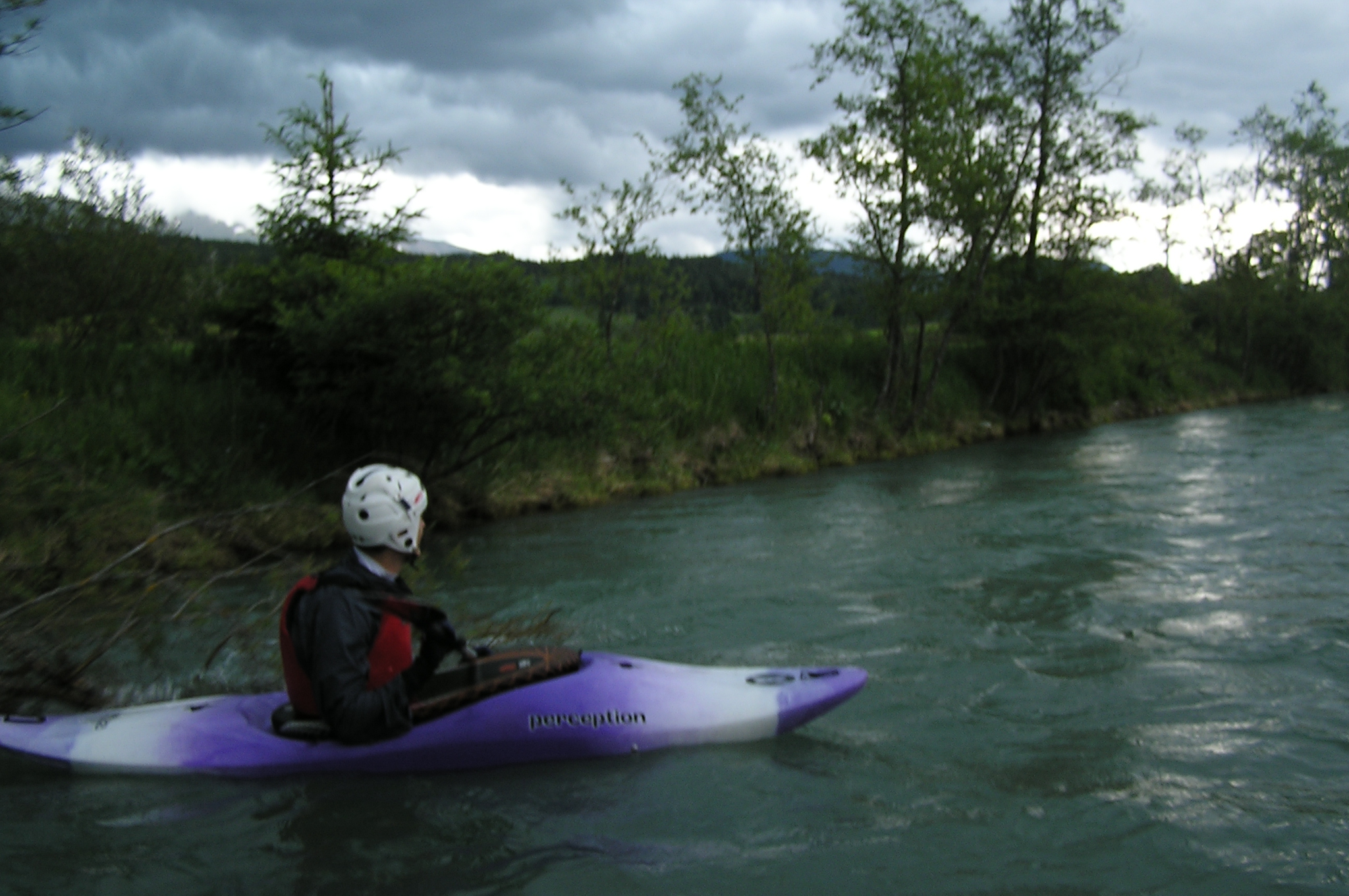 V pátek nás čekala řeka Mur, do které se vlévá Taurach, takže jsme opět vyráželi pohodlně přímo z kempu. Na začátku jsme seskákali několik stupňů a za městečkem Tamsweg jsme vjeli do tzv. Medlinské soutěsky – na jedné straně násep a cyklostezka, případně trať, na druhé straně les a řeka pěkně sviští. Vody je hodně – Taurach i Mur mají jenom o něco méně vody, než jak je klasifikována Hochwasser, v soutěsce nejsou žádné záludnosti, ale vlny jsou pořádné. Na konci soutěsky za mostem nás čeká jediné komplikované místo – levotočivá zatáčka se skalkou vpravo, pod kterou samozřejmě žene proud a pěkná peřej. Všechny posádky úsek sjely bez ztráty květinky, bohužel se nám po focení dramatického úseku podařilo spolu s foťákem zabalit i něco vody, a proto zde končí fotodokumentace… Prosím věnujte na tomto místě tichou vzpomínku našemu věrnému fotoaparátu, čest jeho památce.